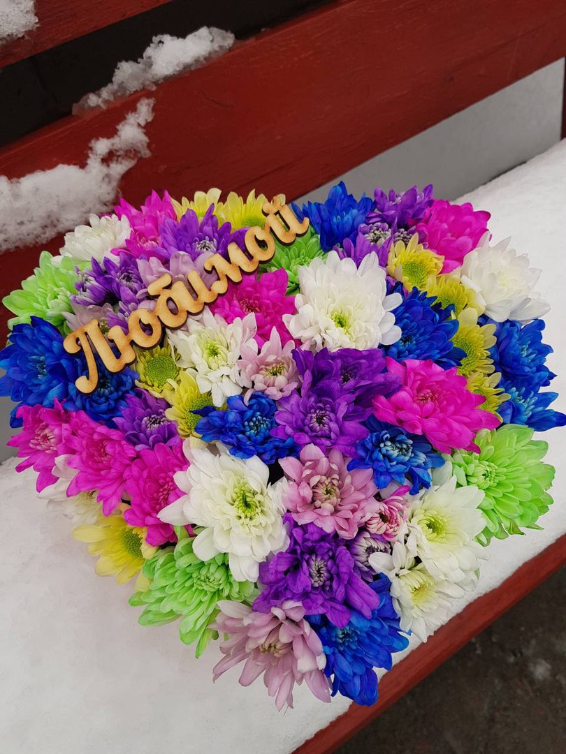 • В цветочную коробку «Любимой» входит: коробка в виде сердца, хризантемы, деревянный топпер.