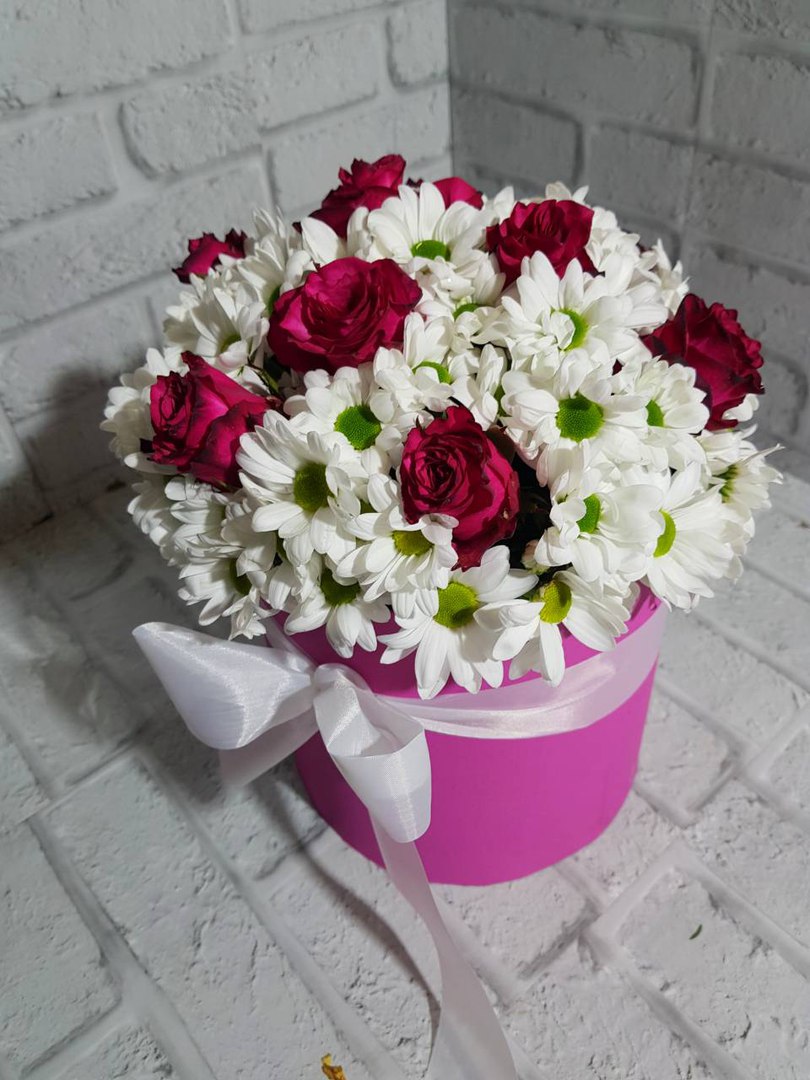 • В цветочную коробку «Для нее» входит: шляпная коробка, розы и хризантемы.