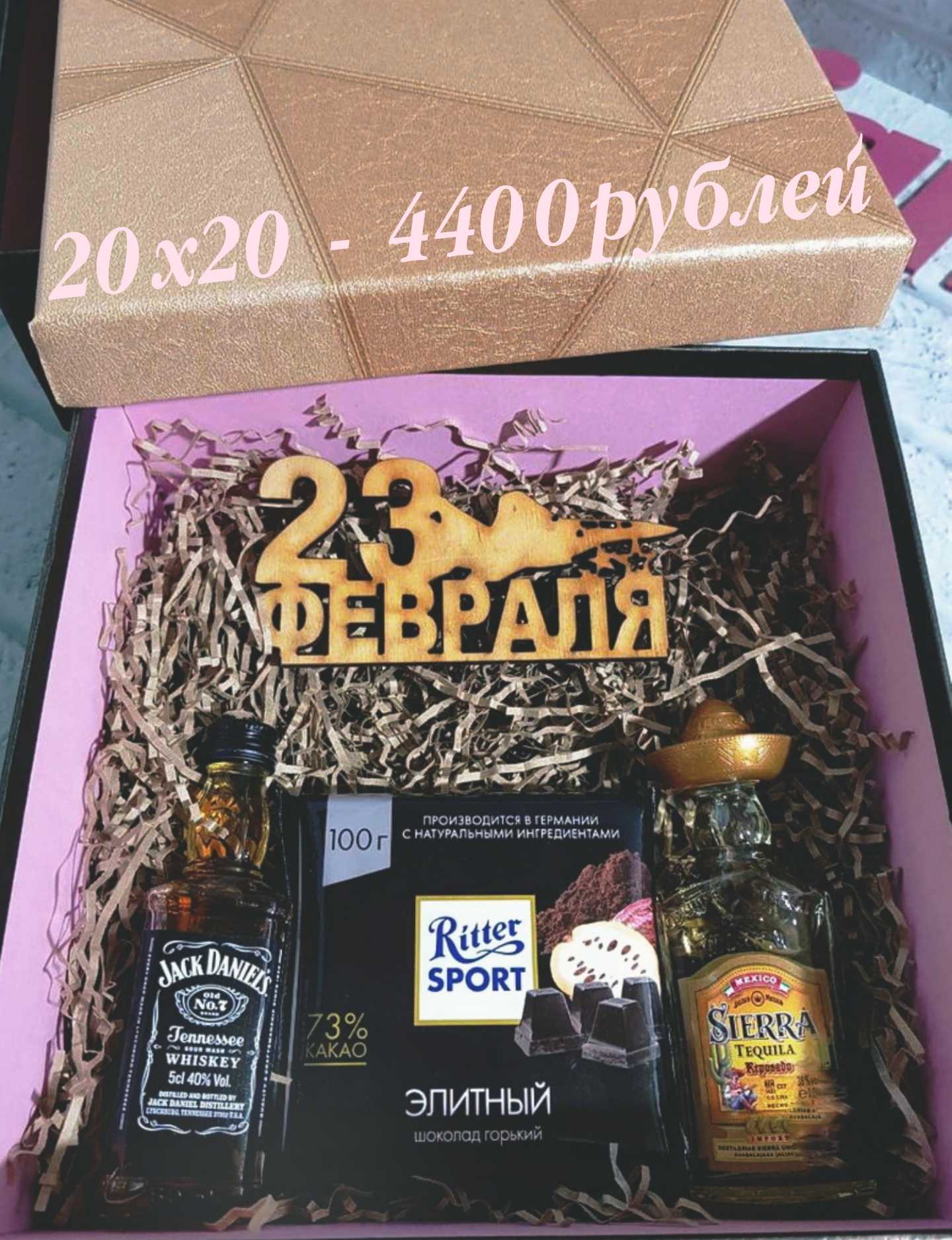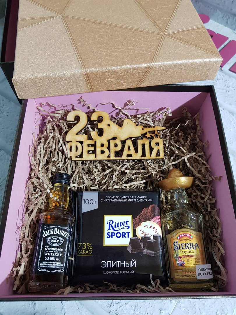 • В коробку «Для него» входит: коробка, «мужские» бутылки (2 шт.), шоколадка Ritter Sport, деревянный топпер, наполнитель.